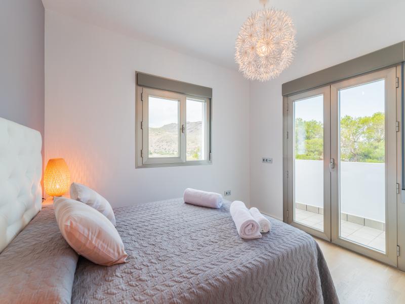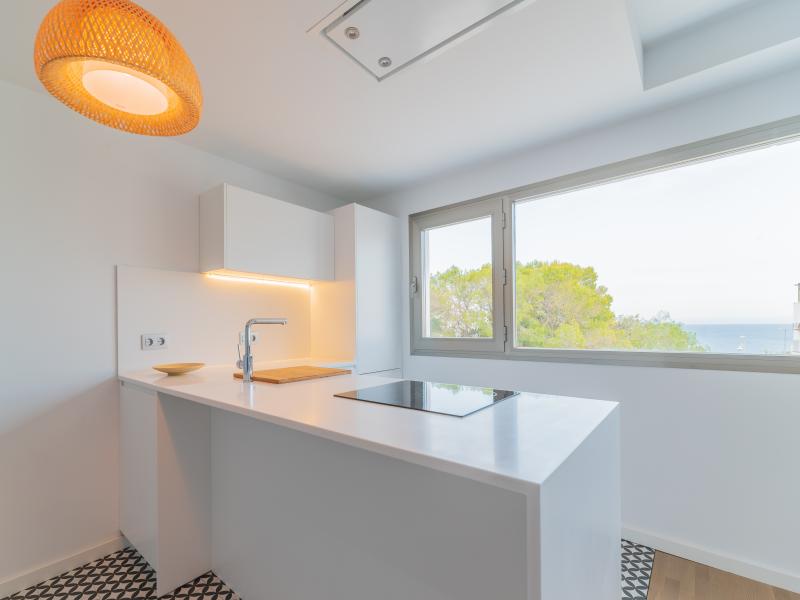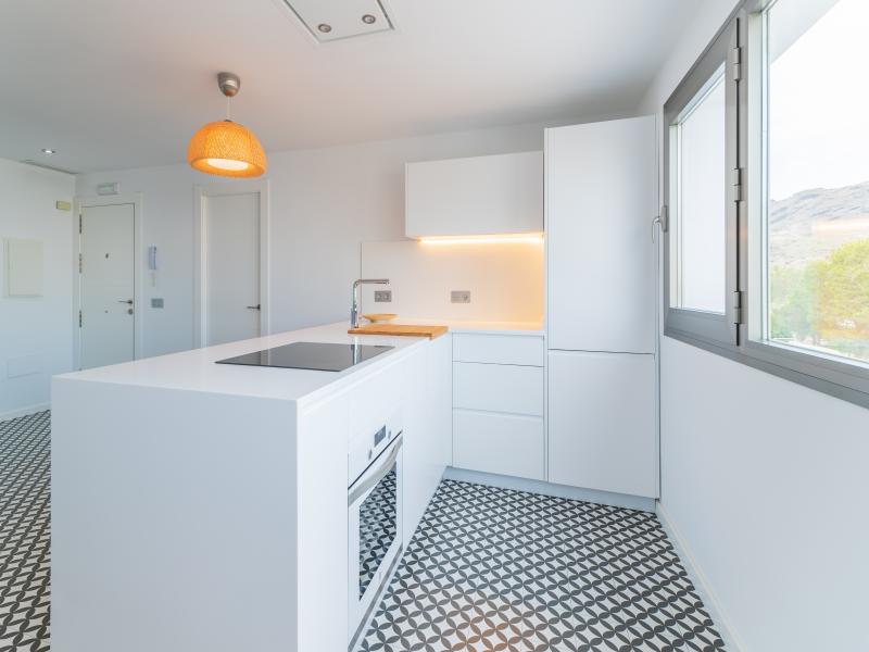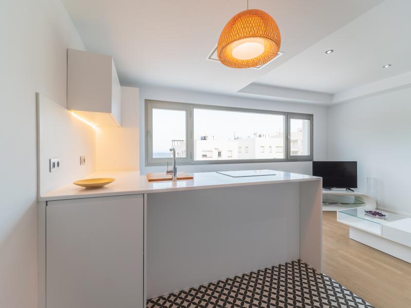 Cocina a salon decorada con una isla desde donde se puede ver el mar. La cocina disponde de lavavjillas, lavadora, cafetera Nespreso y todos los utensilios necesarios para una buena estancia en Las Negras.